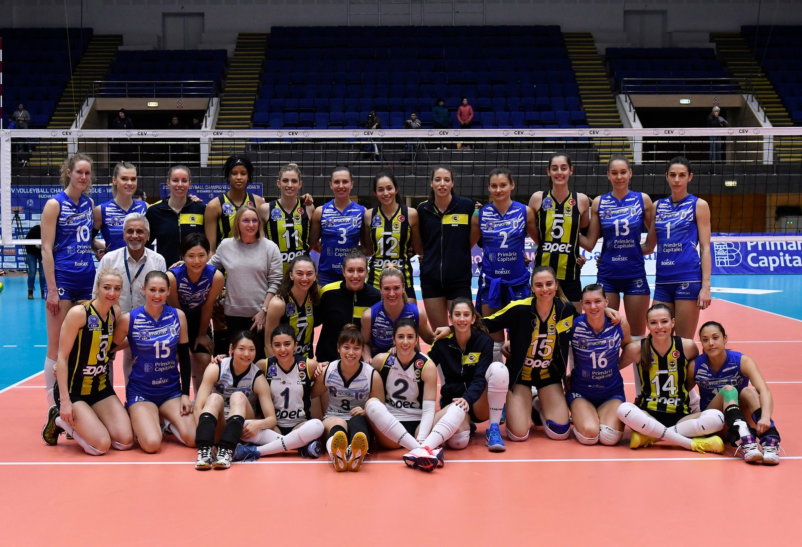 Fotografie de grup dupa meciul de volei feminin dintre CSM Bucuresti si Fenerbahce Istanbul SK, contand pentru Liga Campionilor, desfasurat in Sala Polivalenta-Ioan Kunst Ghermanescu din Bucuresti, marti 26 februarie 2019. © FOTO Razvan Pasarica/SPORT PICTURES