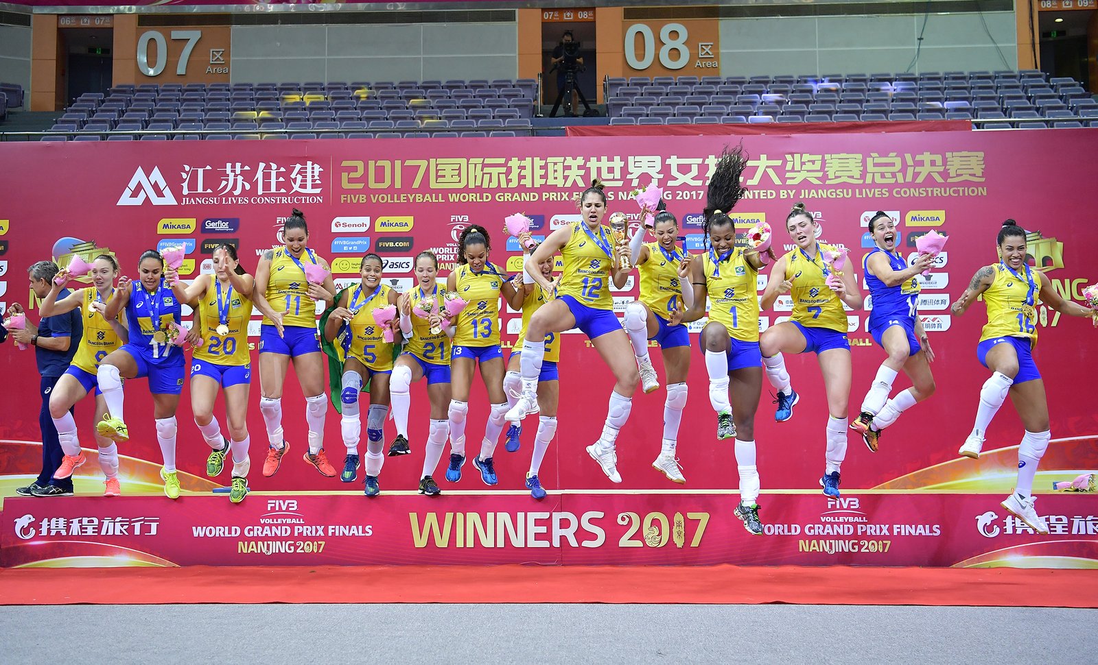 SunJinfanghandsthetrophyto12NataliaPereiraofBrazilduringtheawardingceremonyafterthefinalmatchbetweenBrazilandItalyduring2017NanjingFIVBWorldGrandPrixFinalsonAugust62017inNanjingChina