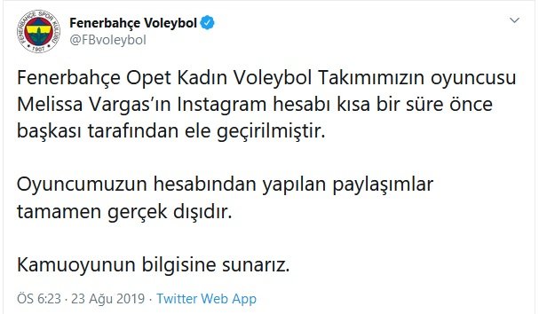 Yıldız oyuncumuz Melissa Vargas’ın instagram hesabından yapılan kulübümüzden ayrıldığı ve Beşiktaş ile görüşmelere başladığı paylaşımı gerçeği yansıtmamaktadır. Oyuncumuzun instagram hesabı çalındığı için bu tarz bir paylaşım yapılmıştır.