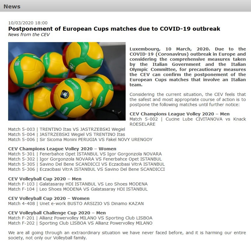 Dünya genelini saran ve İtalya’da da sıkça görülmeye başlayan Koronavirüs salgını nedeniyle, Igor Gorgonzola Novara takımıyla eşleşen kulübümüz ve yine İtalyan temsilcisi Savino Del Bene Scandicci ile eşleşen Eczacıbaşı Vitra kulübü maçların ertelenmesi için CEV’e başvurmuştu. CEV 01.03.2020 tarihinde yaptığı açıklamada bu maçların ertelendiğini bildirmişti.